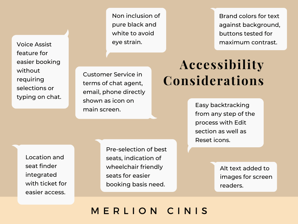 Easy Backtracking, navigation, screen reader friendliness and personalization basis user preferences where few of the main focus in the design. Quick Booking feature includes location feature to personalize cinema listing basis nearness, seats count to showcase recommendations and quicker seat selections.