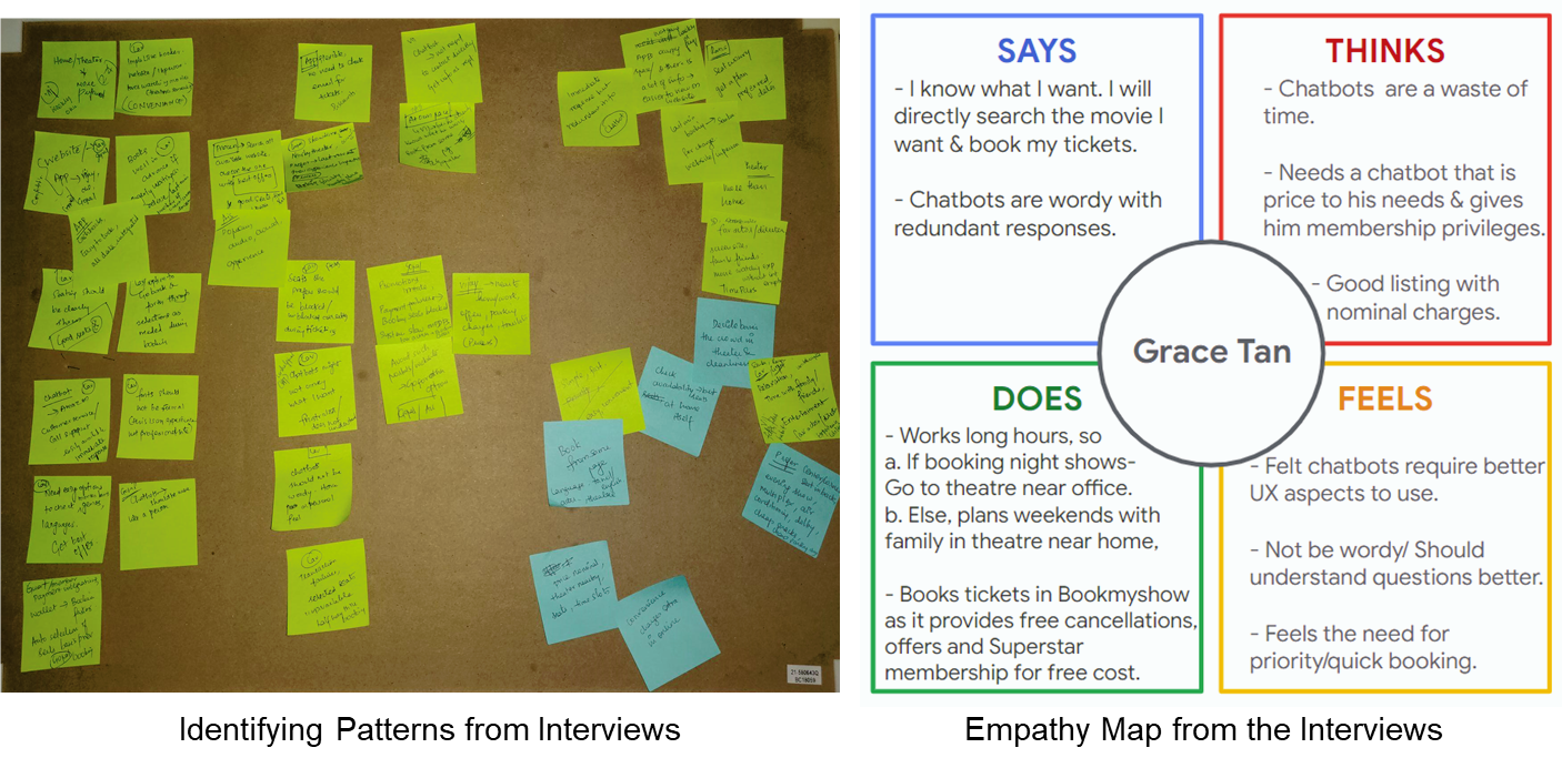I created empathy maps and user stories using the primary research data and was able to break it down into 2 personas out of which the primary user group was frequent movie goer looking for a prioritized personalized experience.