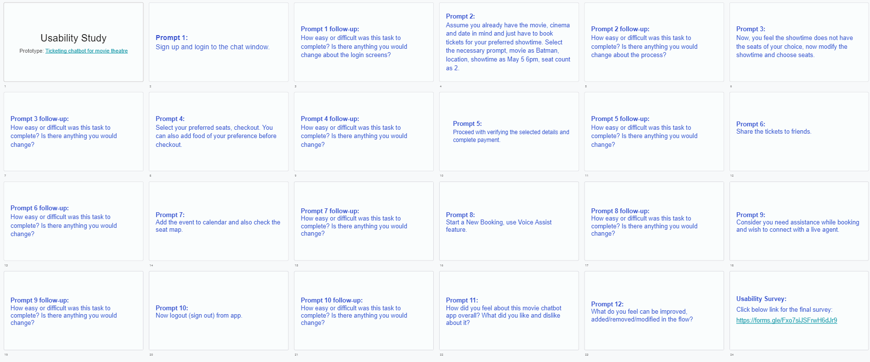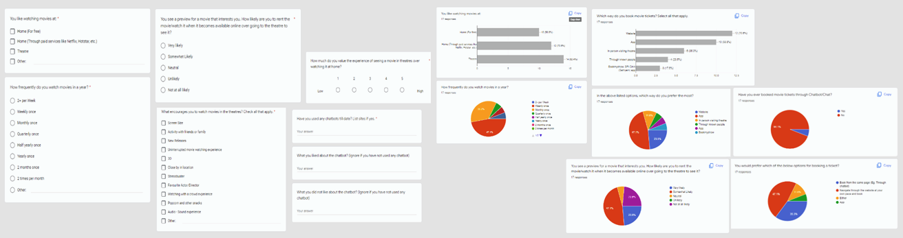 I conducted 8 interviews and 17 surveys to get an understanding of the audience I am designing the chatbot movie ticket booking app for and their needs, behaviour and pain points.