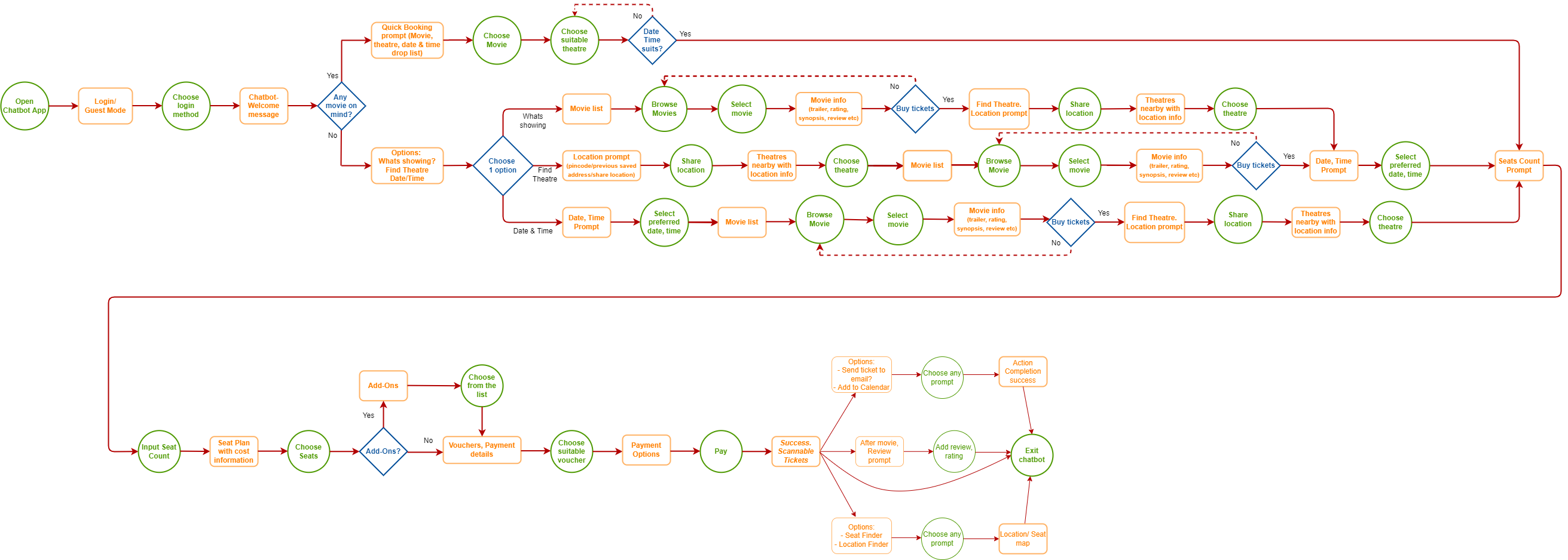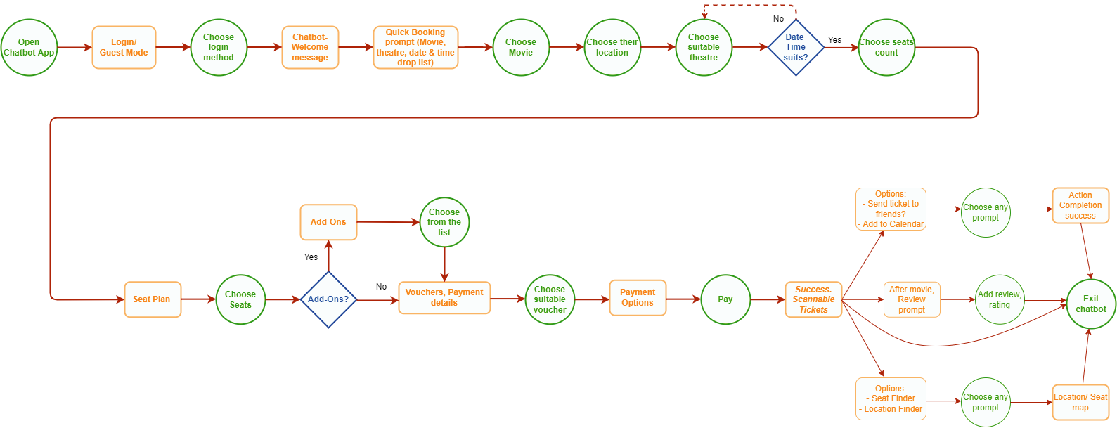 The user flow shows the overall movie chatbot app with its 4 flows- Quick Booking, Start with movie selection, start with cinema selection or start with the date & time of preference.