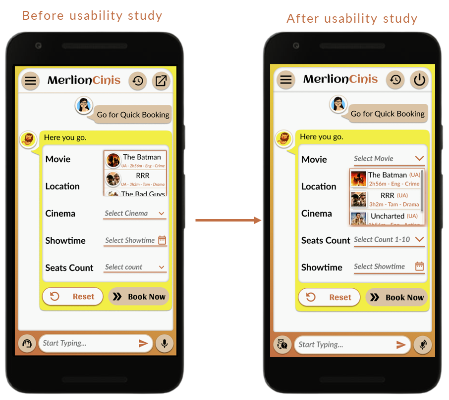 The final high-fidelity prototype showcases Quick Movie Booking flow the user needs along with easy accessibility in terms of quick customer support, voice assistance, backtracking in a personalized chatbot experience with recommendations in terms of nearby cinemas, preselection of best seats, and more.