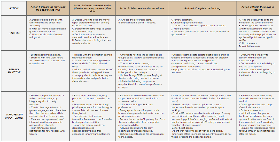 Goal: Enjoy easy and premium movie ticket booking experience.Mapping Grace’s journey helped reveal the areas of design and accessibility improvements required at each step of their journey and how a chatbot can be designed to provide a personalized experience.