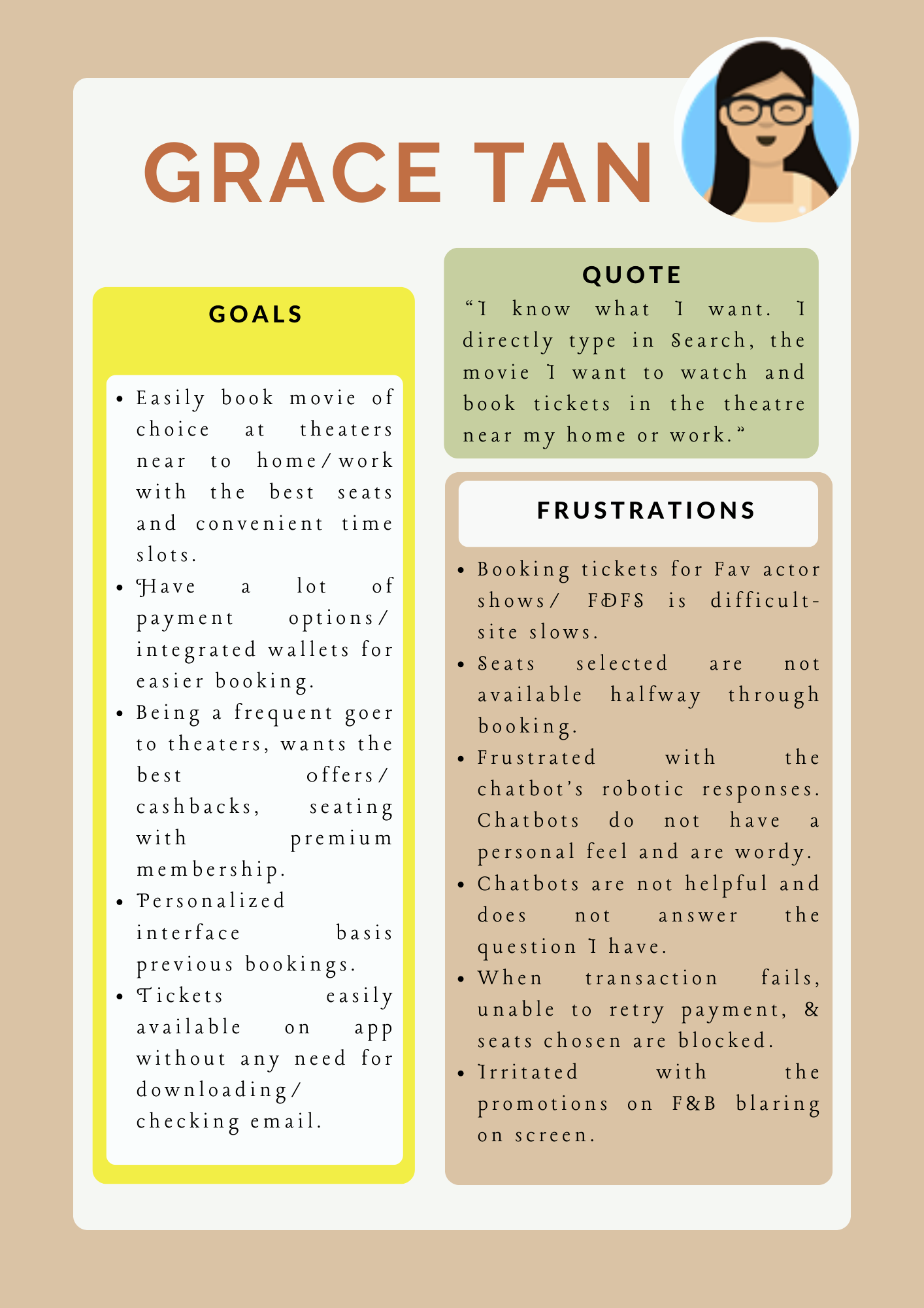 Grace Tan, a busy professional is a movie freak who needs an on the go quick personalized movie booking experience because she wants to relax and enjoy the movie at comfortable timings and seats after long tiring workdays.
